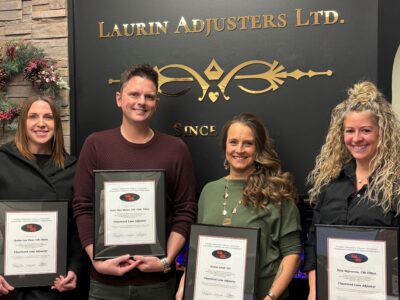 CIAA is pleased to announce that Kyler Hart-Moore, CIP, CLA, CRM, FIFAA; Bobby-Lyn West, CIP, CLA, FIFAA; Erin Skjersven, CIP, CLA, FIFAA and Nadine Adolf, CIP, CLA, all from Laurin Adjusters, Grande Prairie, AB were recently awarded the Chartered Loss Adjuster (CLA) accreditation.  Having met stringent experience and competency requirements, Kyler, Bobby-Lyn, Erin and Nadine successfully completed a further 60 hours of comprehensive claim specific courses including technical property courses, adjuster skill and knowledge courses as well as legal concept courses in contract law and tort law.